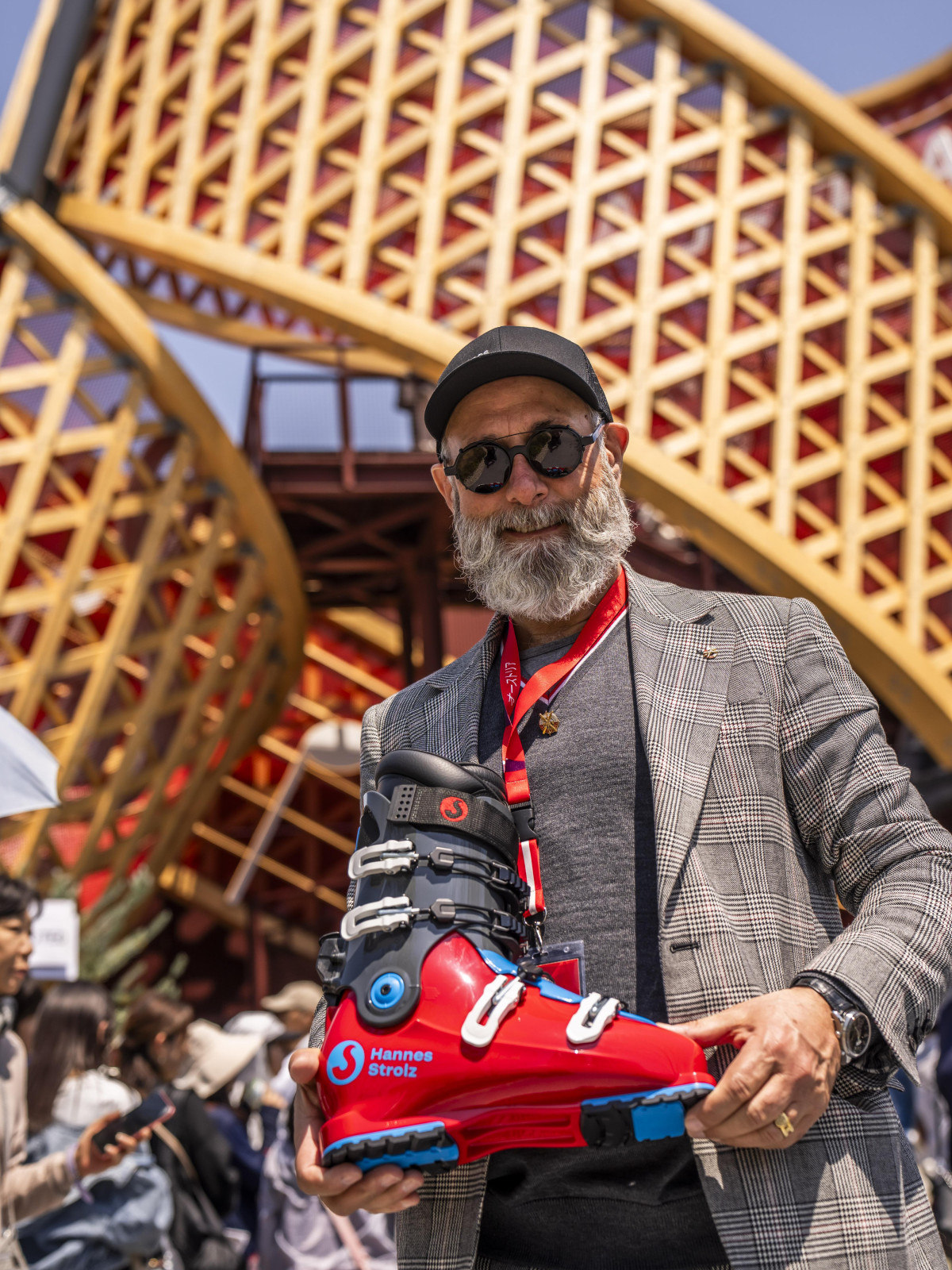 In keeping with the family tradition, Hannes presented the Arlberg ski boots at the EXPO 2025 World Exhibition in Osaka. The EXPO brings people from all over the world together to showcase innovations and think about the future together. Hannes designed a special ski boot for this international audience – inspired by the colors of the official EXPO 2025 logo.